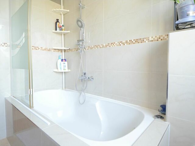 Im ersten Stock befinden sich zwei Schlafzimmer und ein Badezimmer mit Badewanne, Dusche, Waschbecken und Toilette.